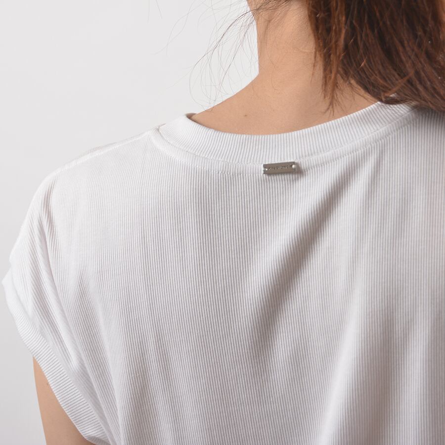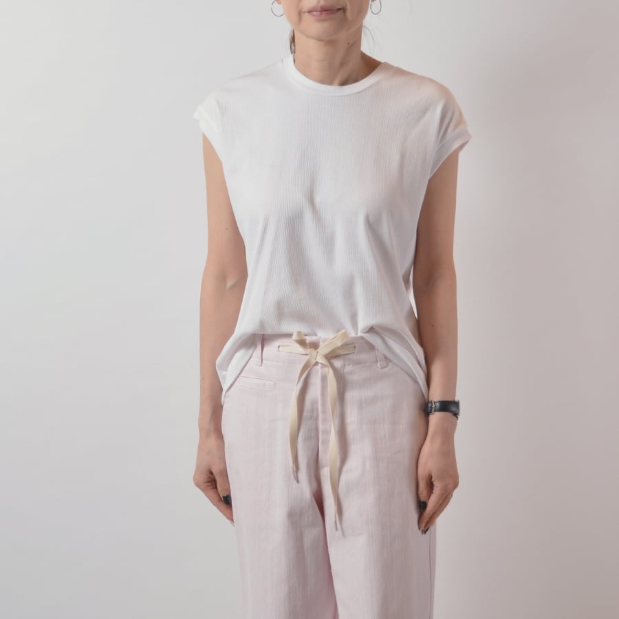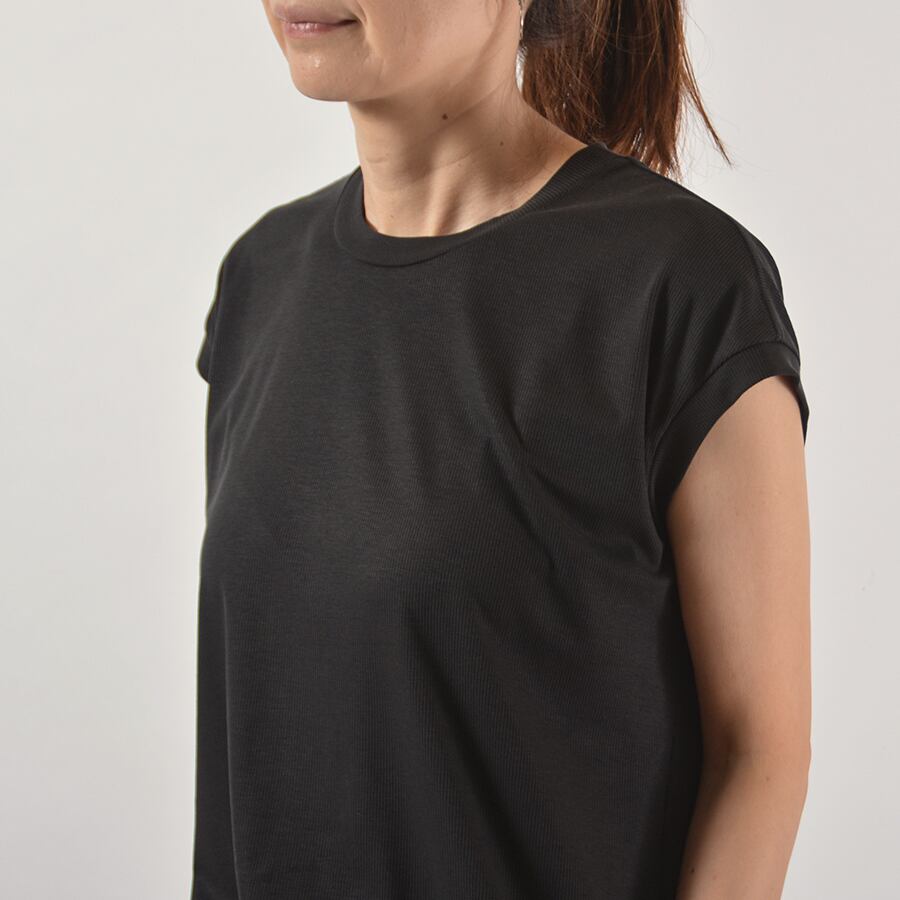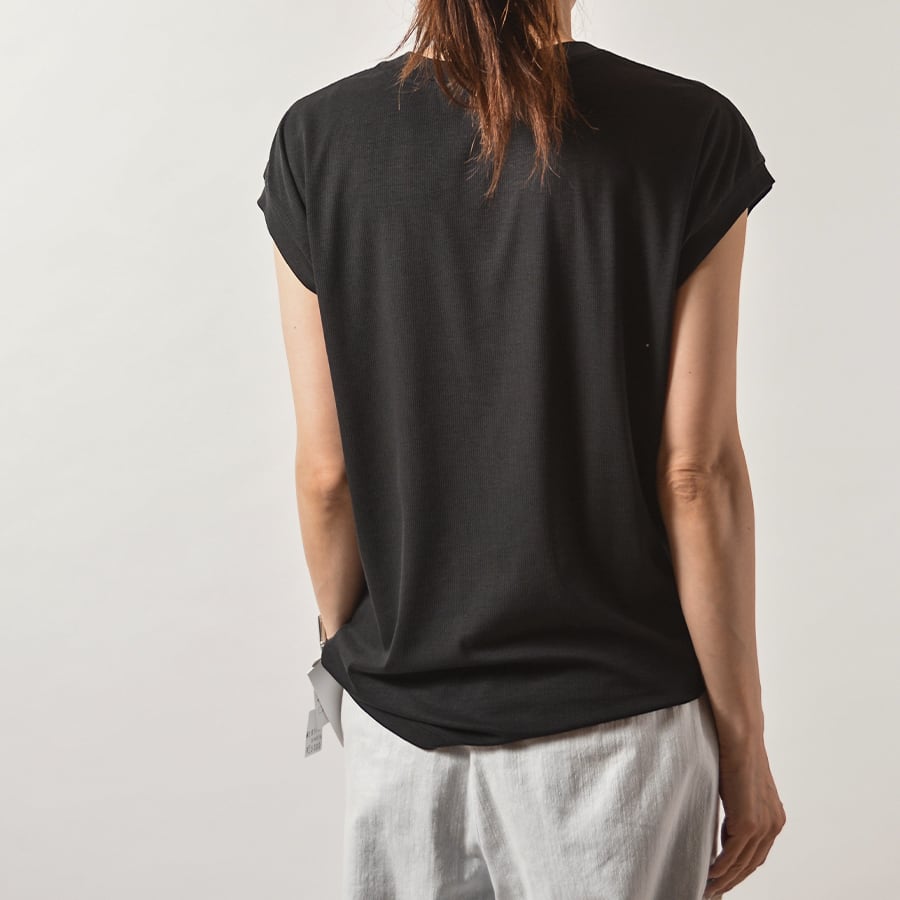 滑らかでしっとりとした手触りのフレンチスリーブ。身体の線を拾いにくゆるいリブで、とってもシンプルなデザイン。ジャケット等のインナーにもおすすめです。