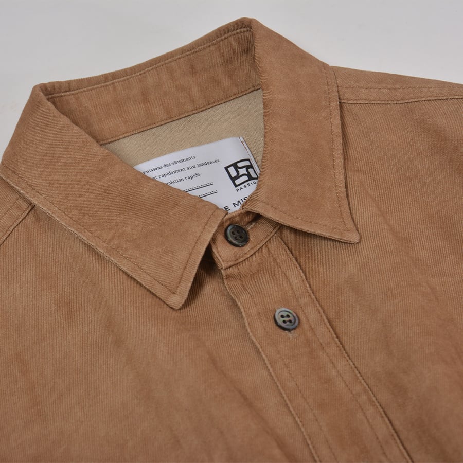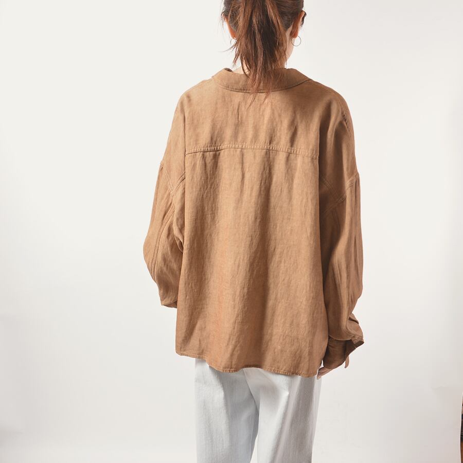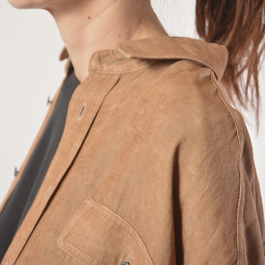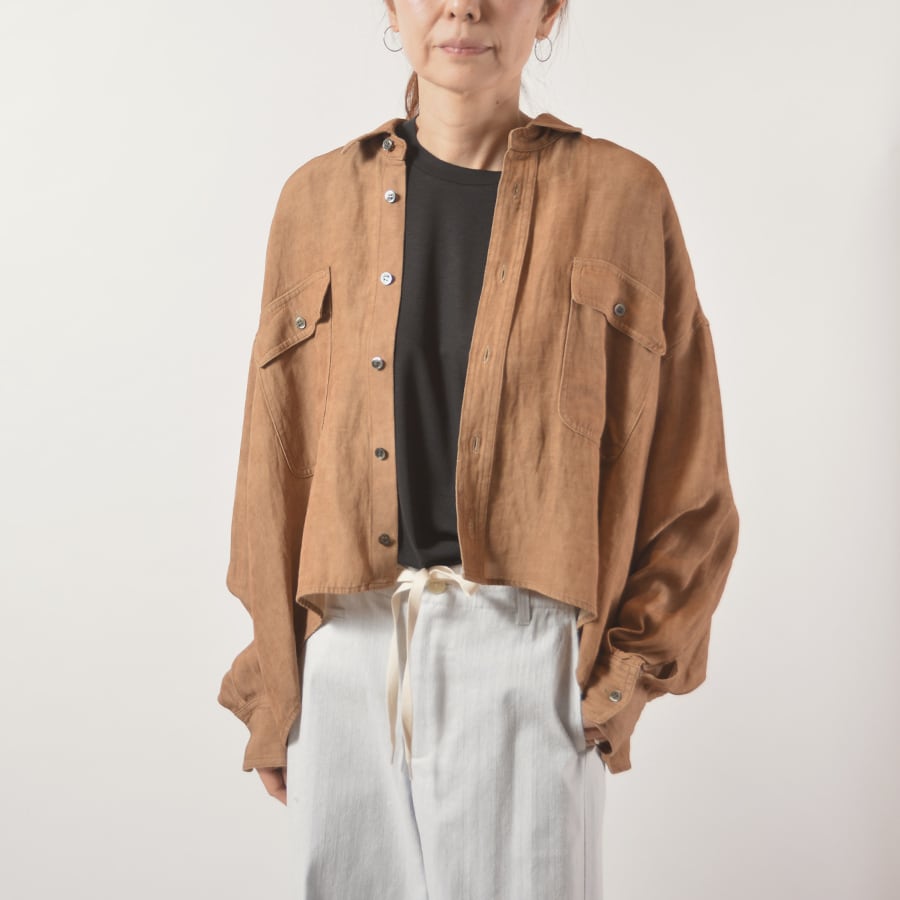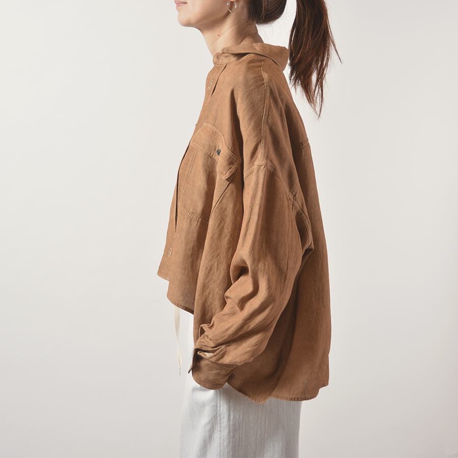 麻が入っていてもシワになりにくい、テロっとした落ち感と弾力があるレーヨンメイン生地。ムラがある素敵な染めと、後ろ下がりでゆったりシルエット。