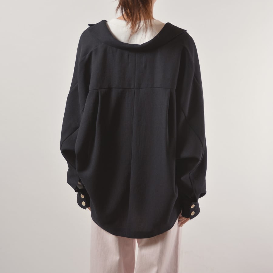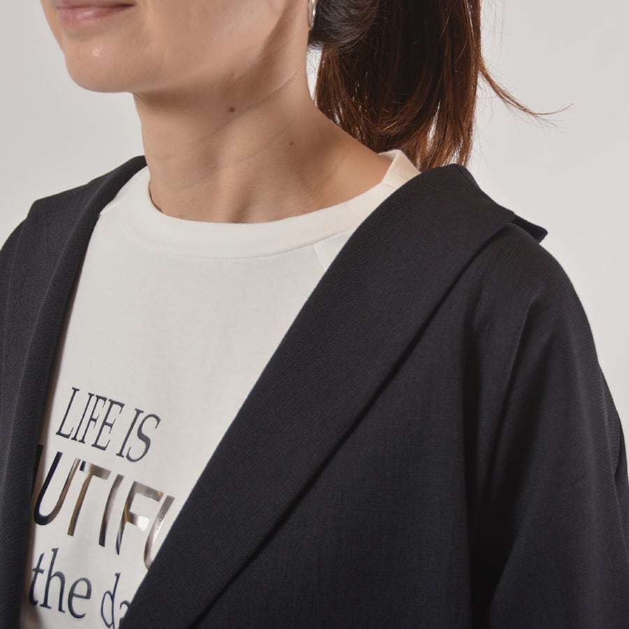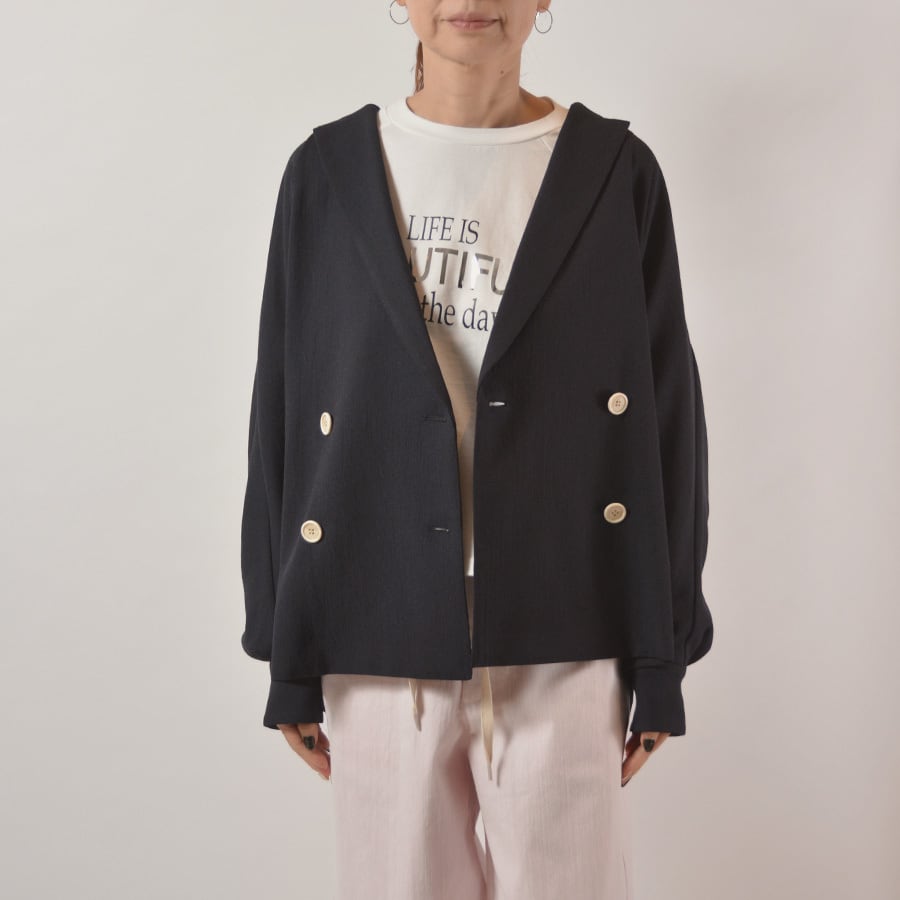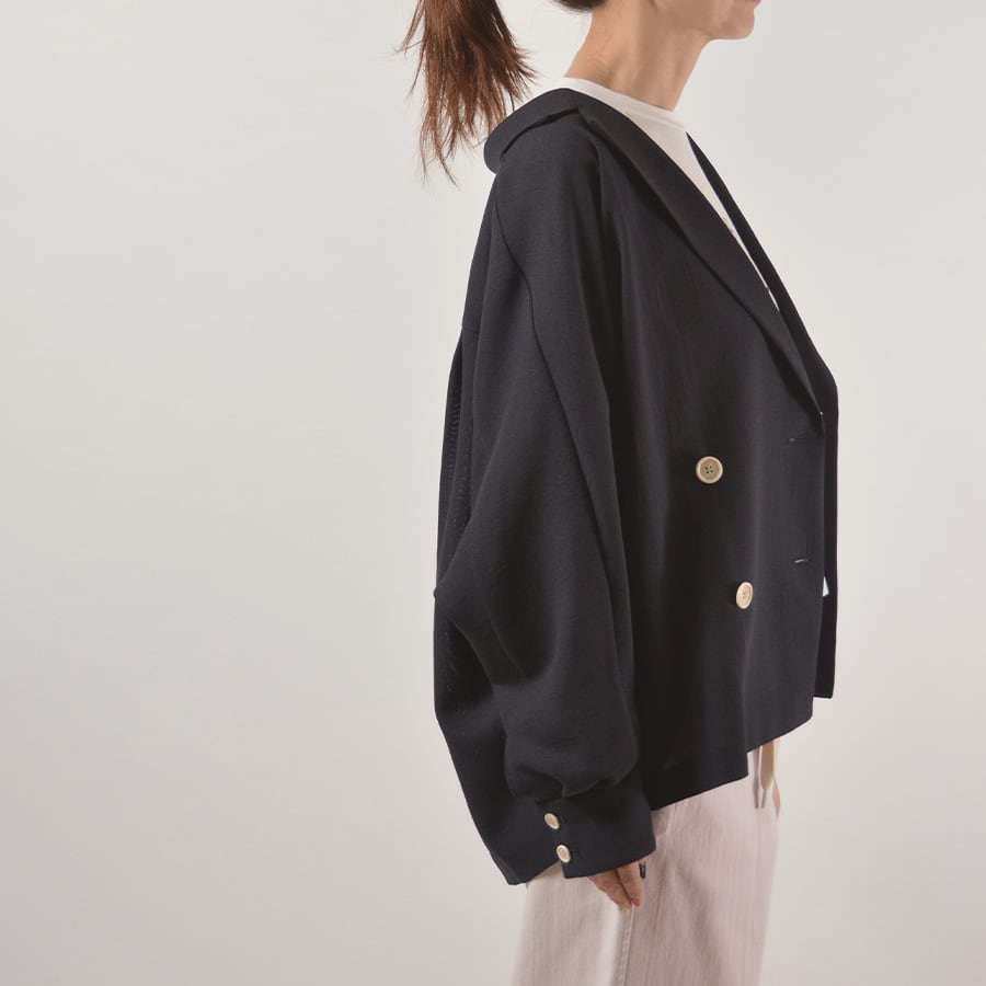 透け感がある薄手のポリエステルジャージー素材のダブルジャケット。リラックス感があるシルエットと素材感で、緩めの着こなしでも綺麗めに決るジャケットです。