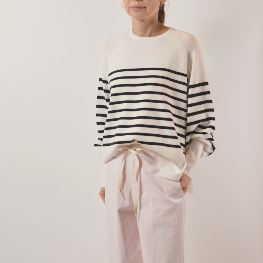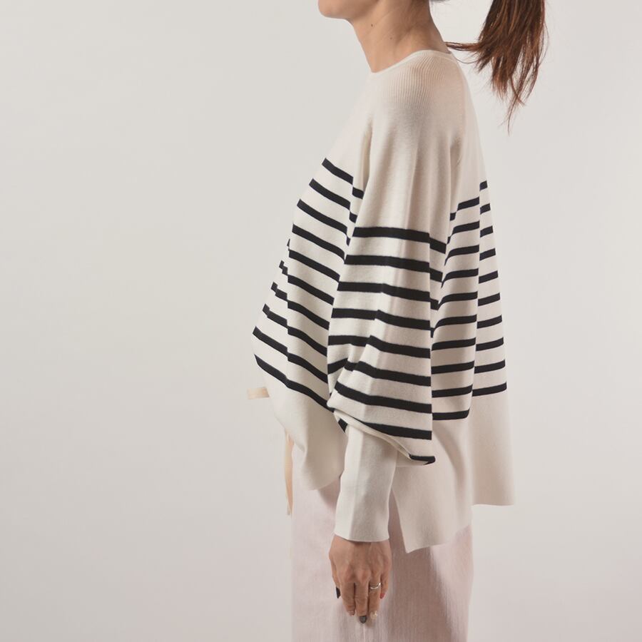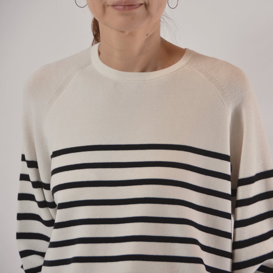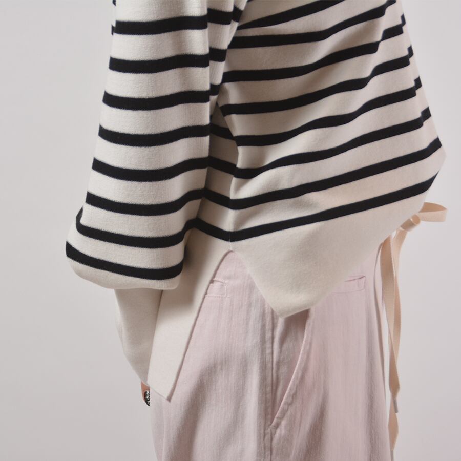 柔らかいセルロースニット。ラグランスリーブと相まって、楽な着心地。サイドスリット入り、カフスのリブは長めで、バルーンスリーブになっています。