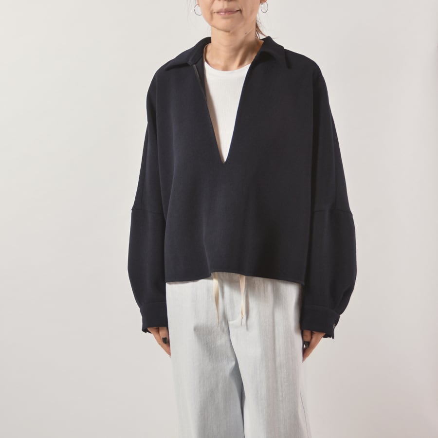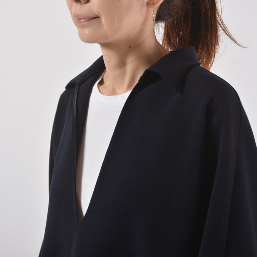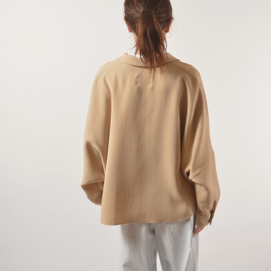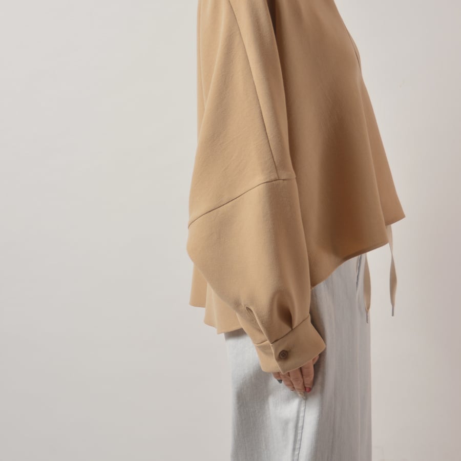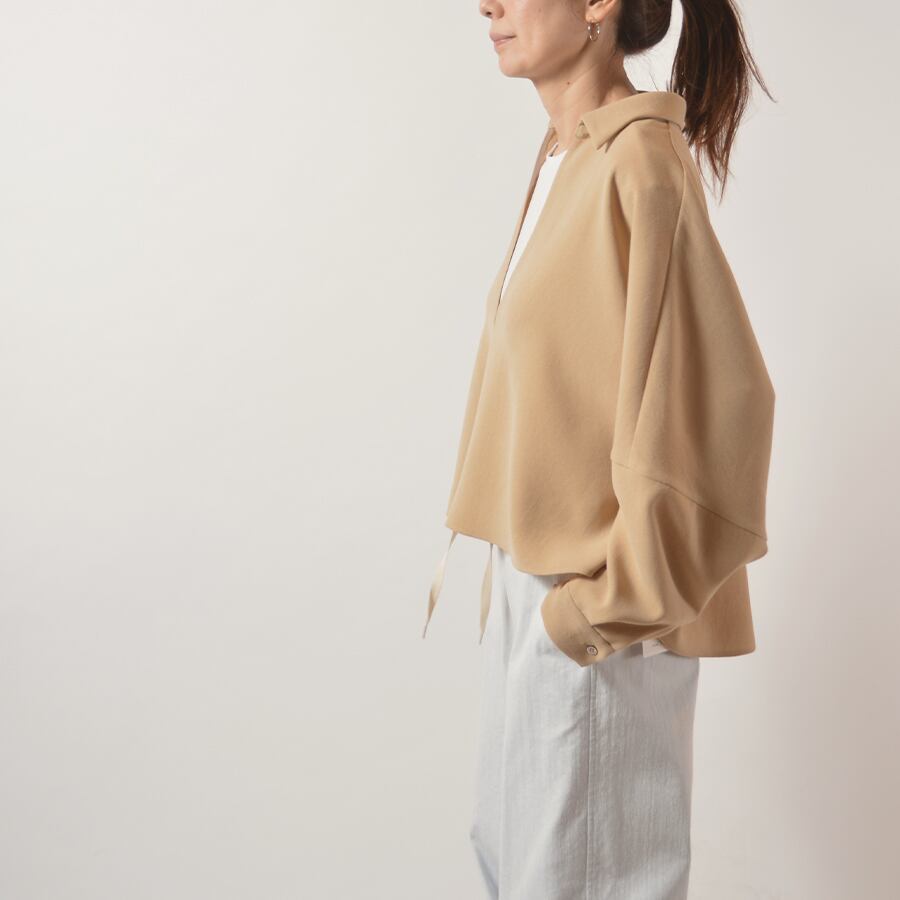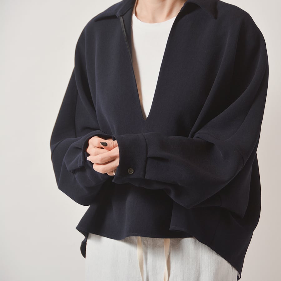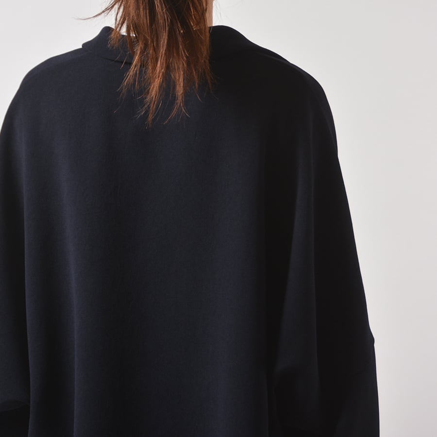 弾力があるポリエステルジョーゼットのスキッパーネックトップス。ドルマン風のワイドなサイズで、ゆったり丸いシルエットです。