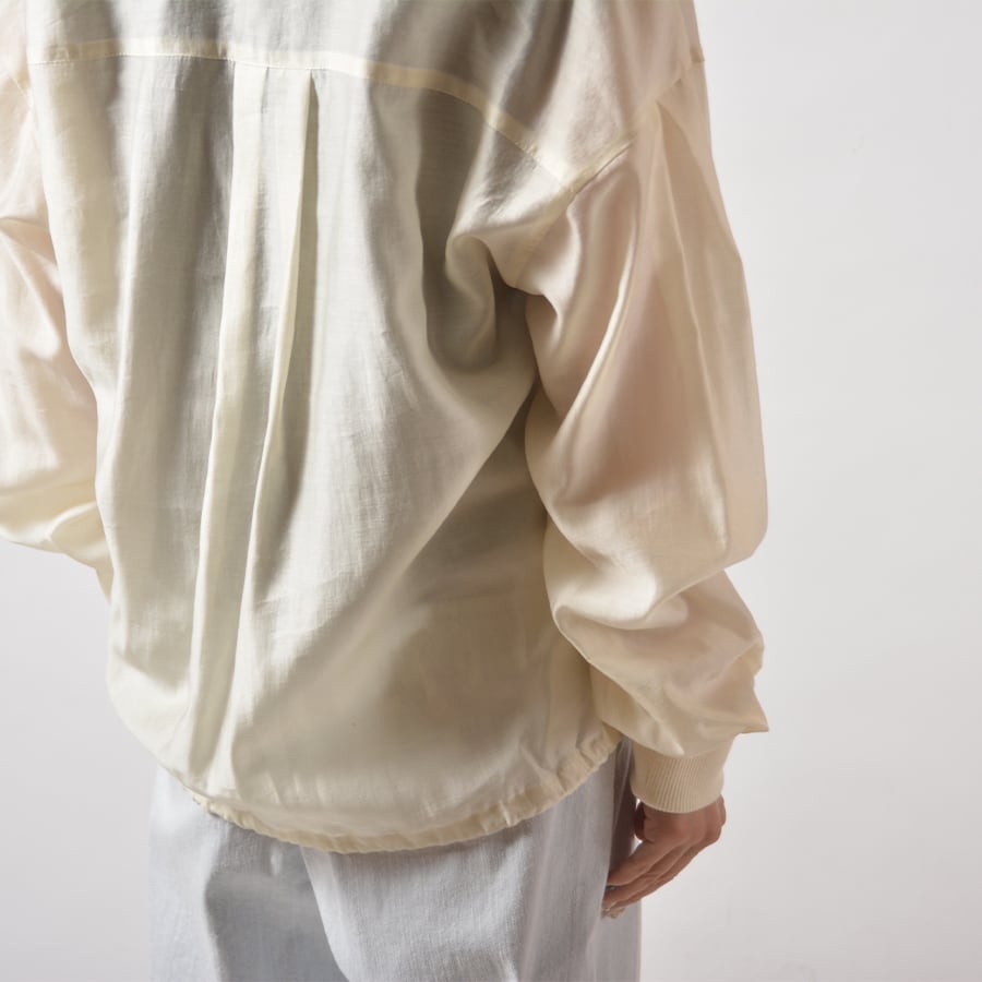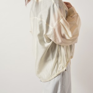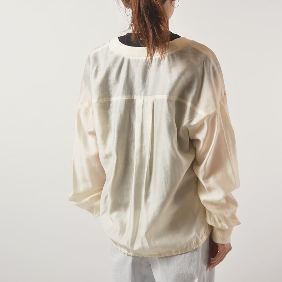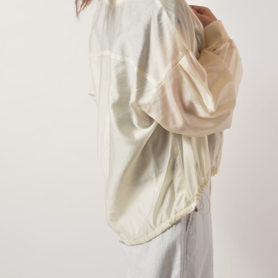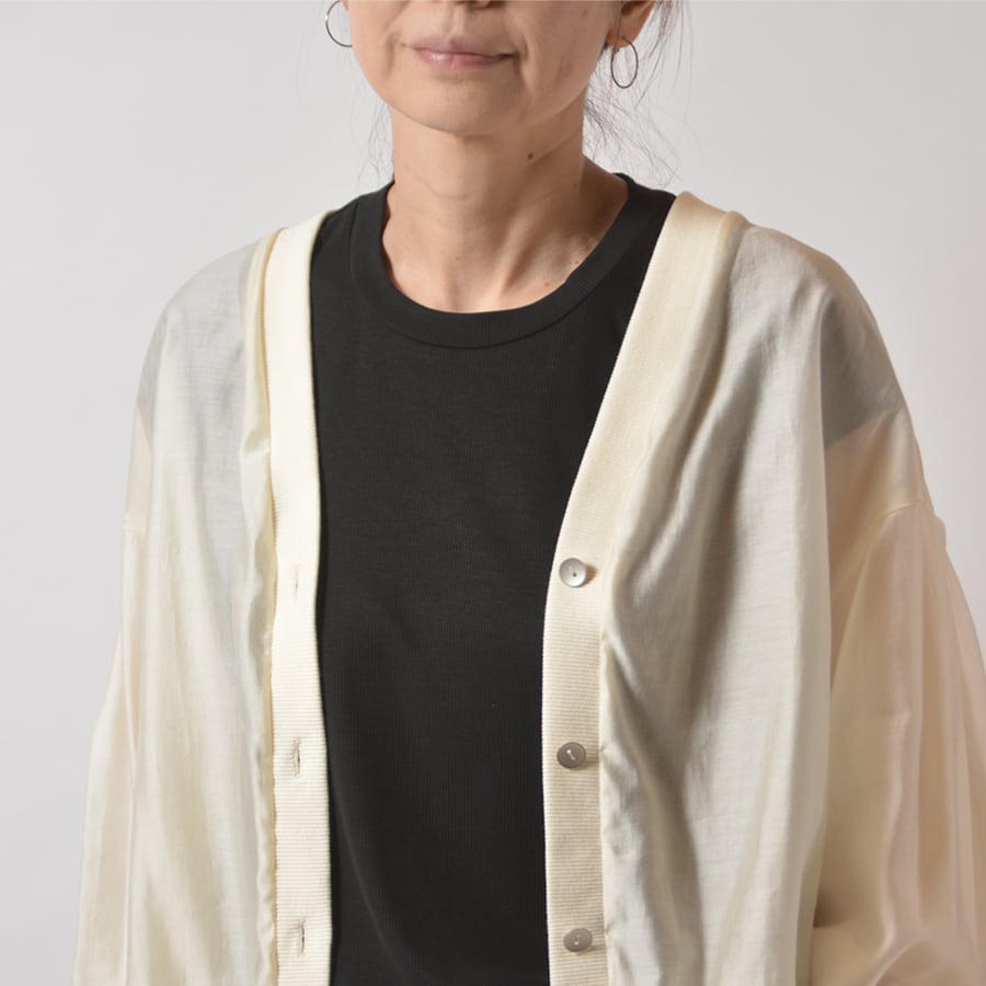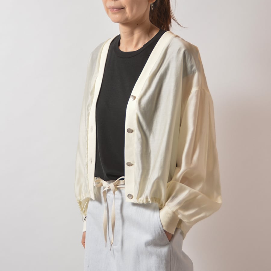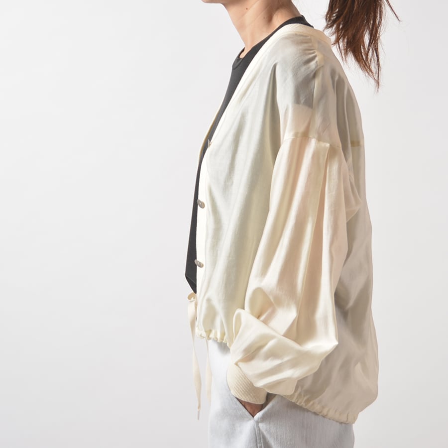 薄く透け感がある布帛をメインに、前立てとカフスをリブに切り替えたカーディガン。程よい光沢も合って品の良いアイテム。裾のアジャスターで絞りの調節も可能です。