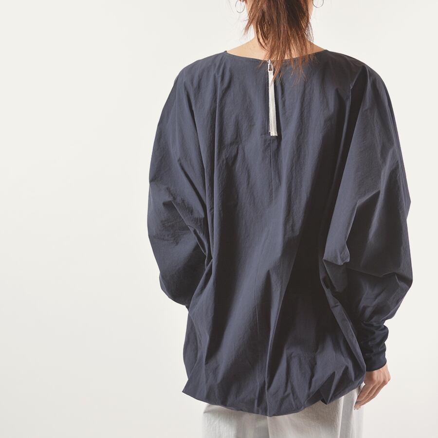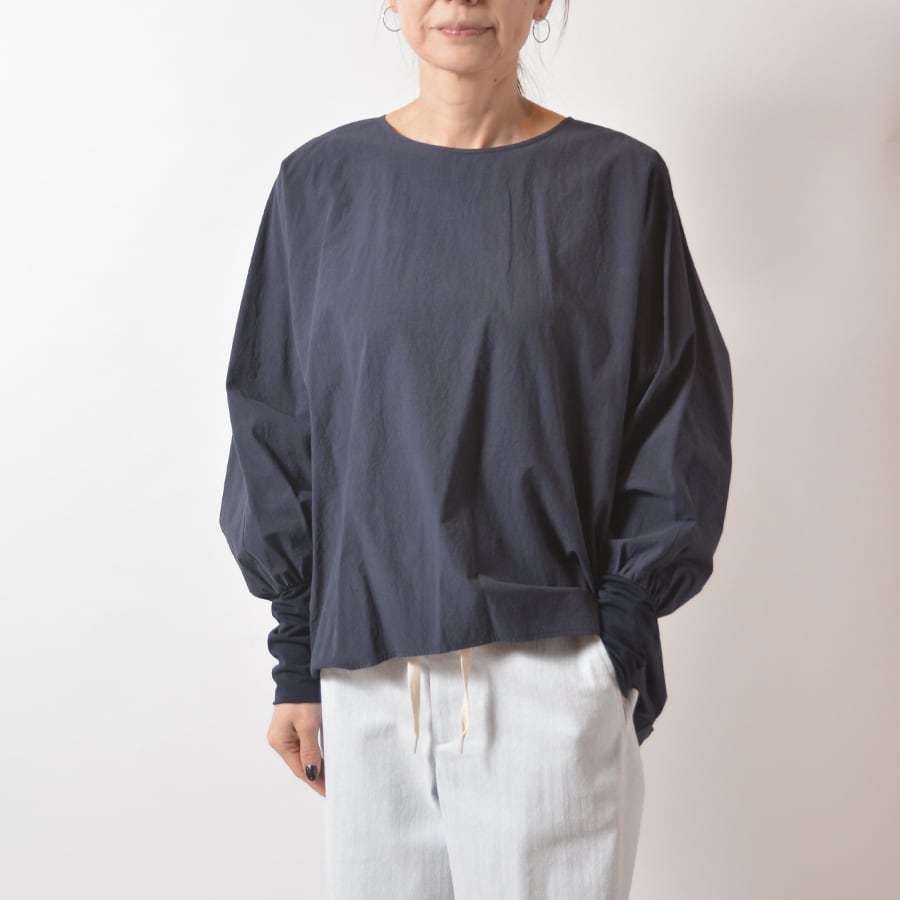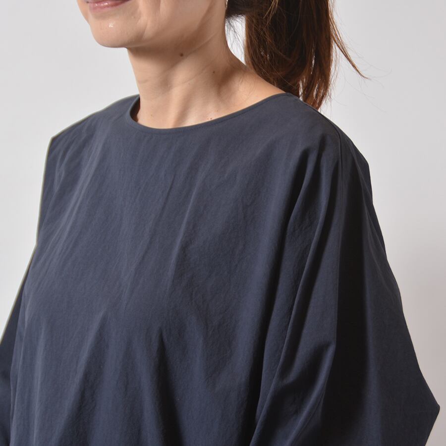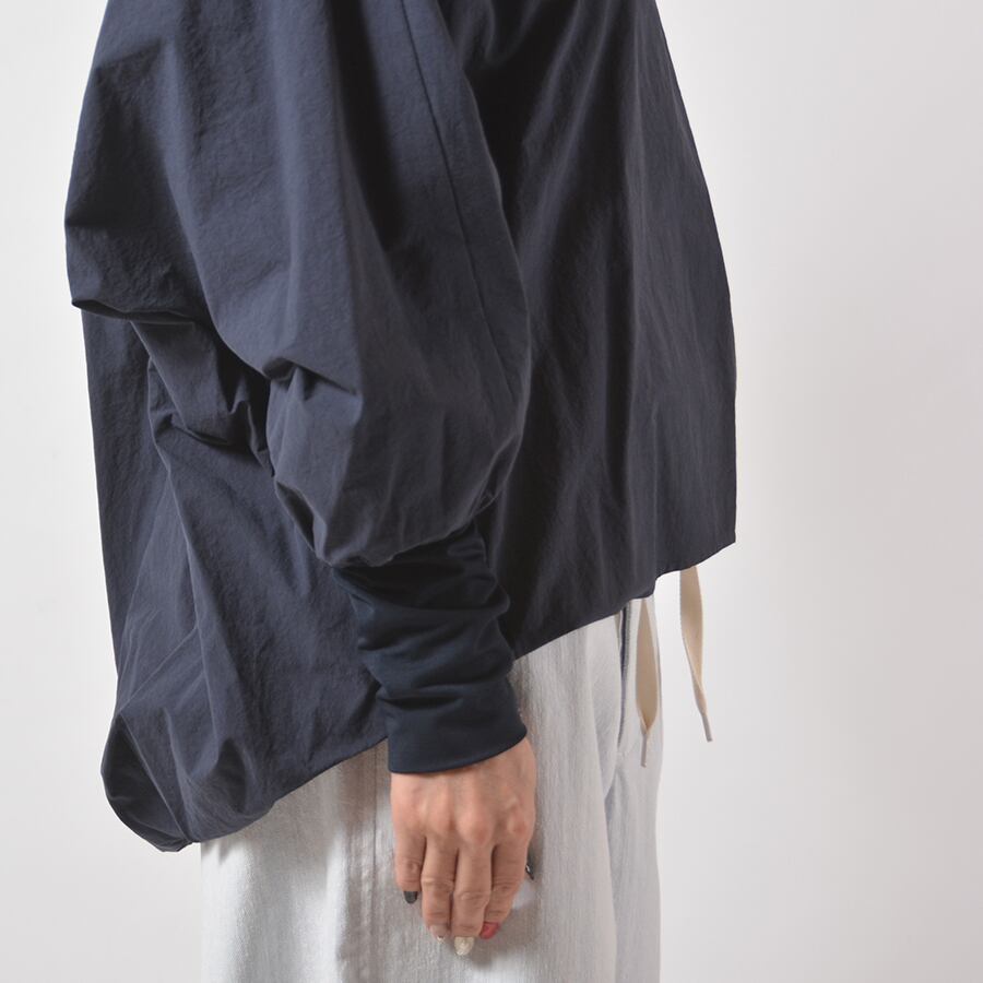 カシャカシャとした質感のプルオーバー。袖口はタイトなストレッチジャージーに切り替えて、裾には丸みを出したコクーンシルエット。ドルマンスリーブで幅広い方に綺麗なシルエットでお楽しみいただけます。
