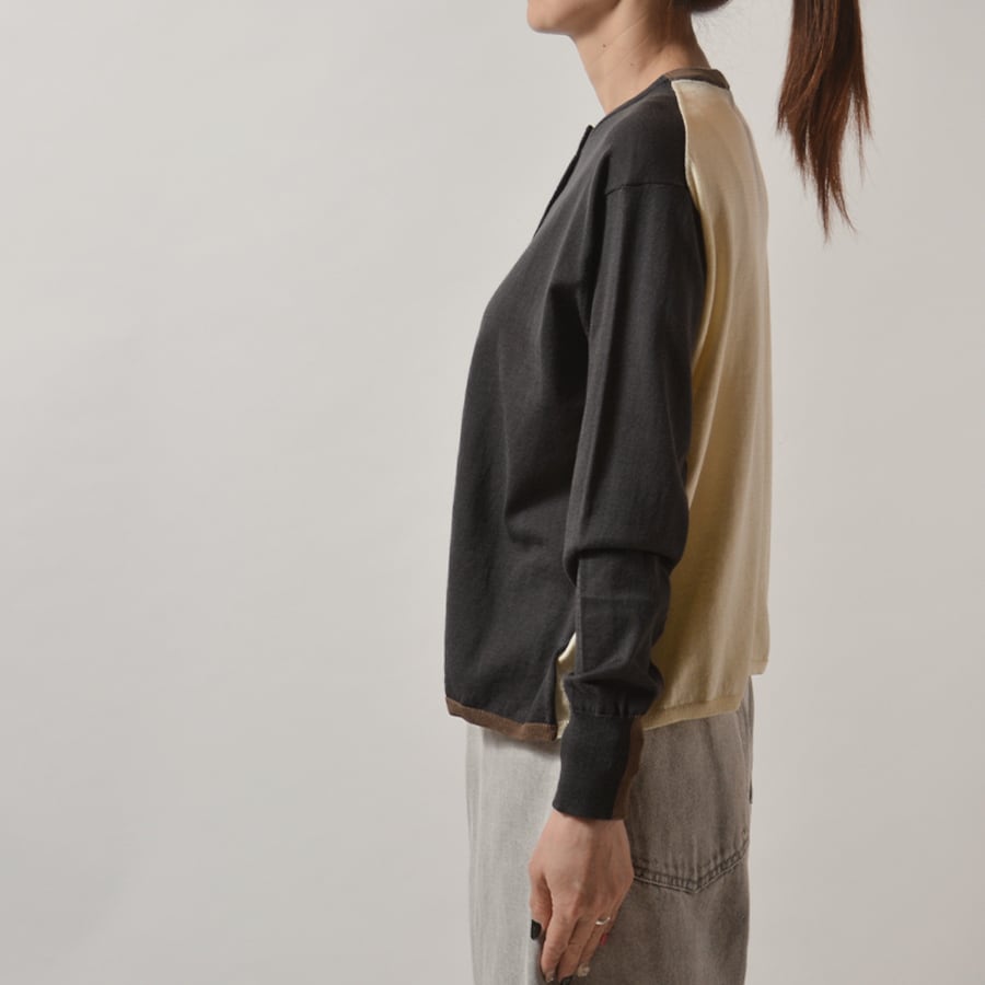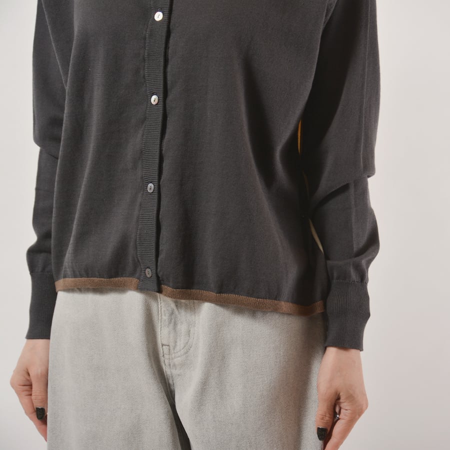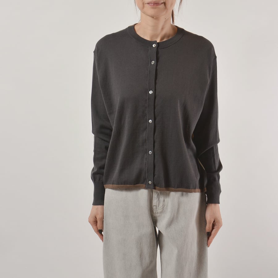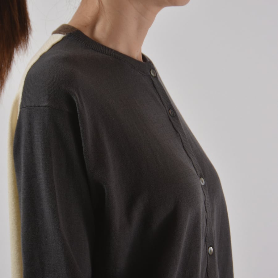 前後で大胆に配色を切り替えて、さらに袖口や裾などの一部もさりげなく色を切り替えた3色使いのカーディガン。