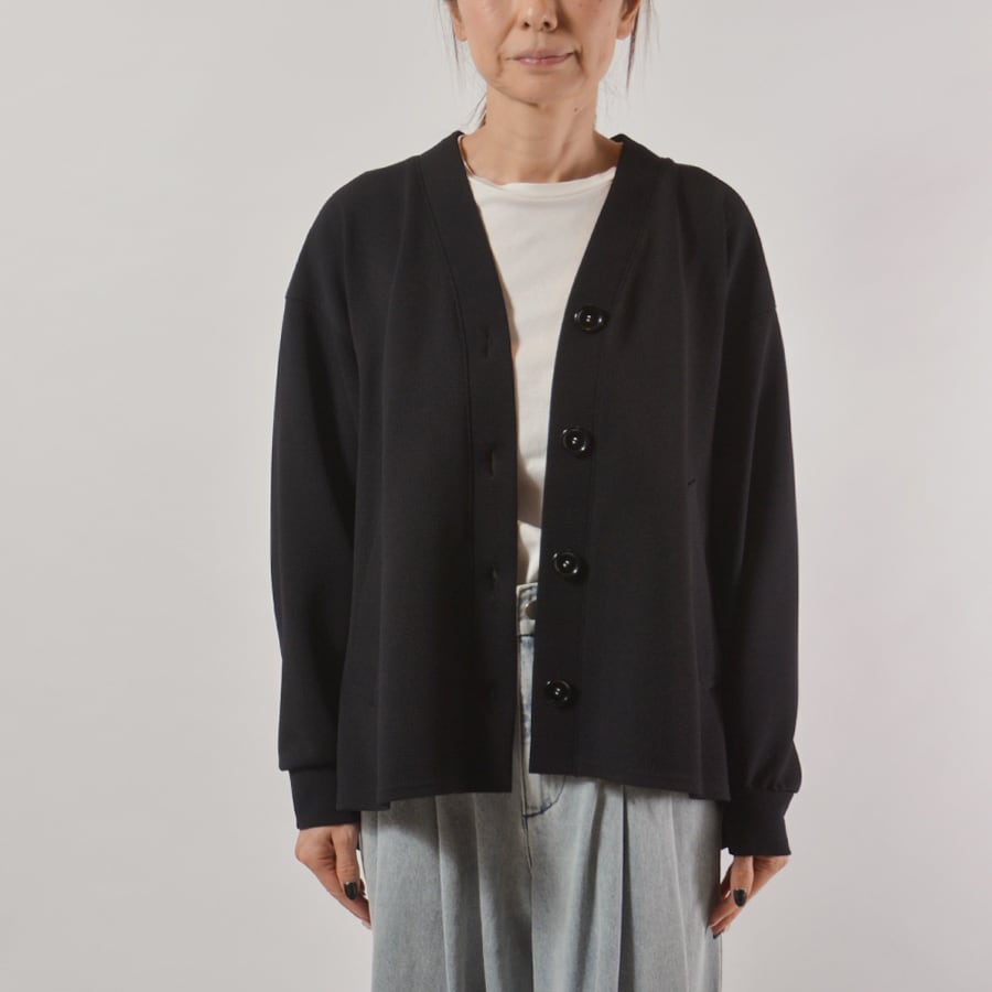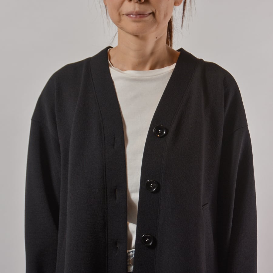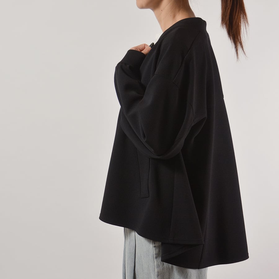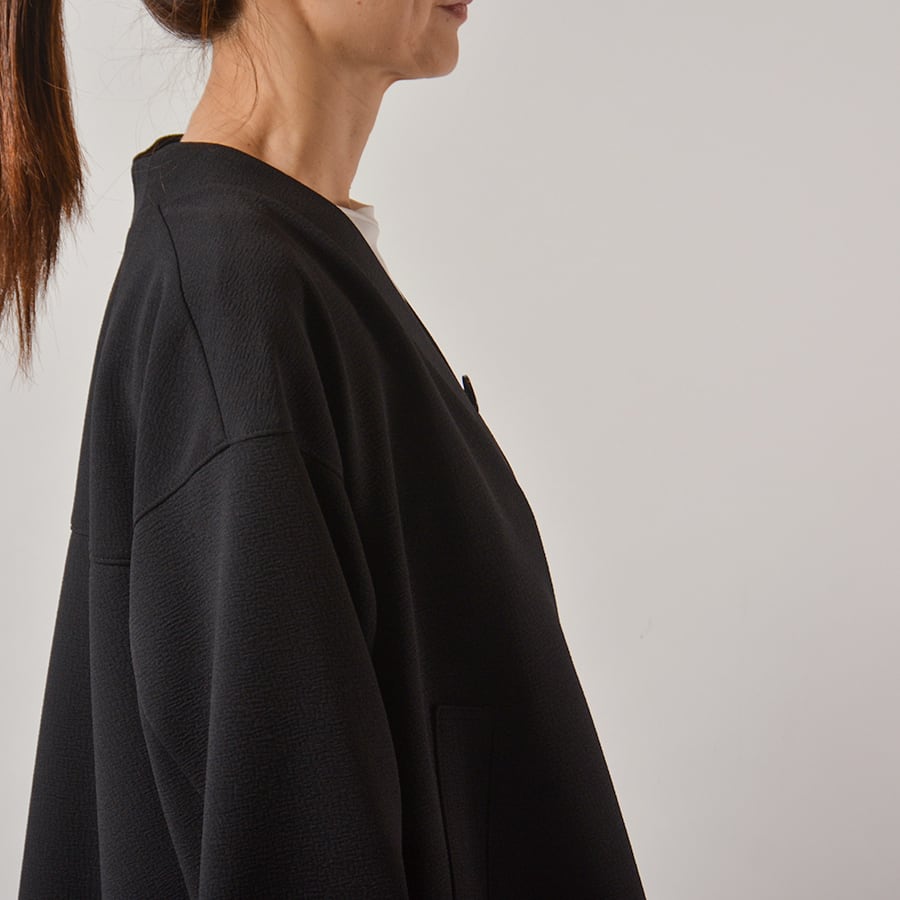 弾力があってシワになりにくいダブルフェイス素材。表面にシボがある梨地ニットの素材感が素敵です。ワイドでフレアなシルエットです。