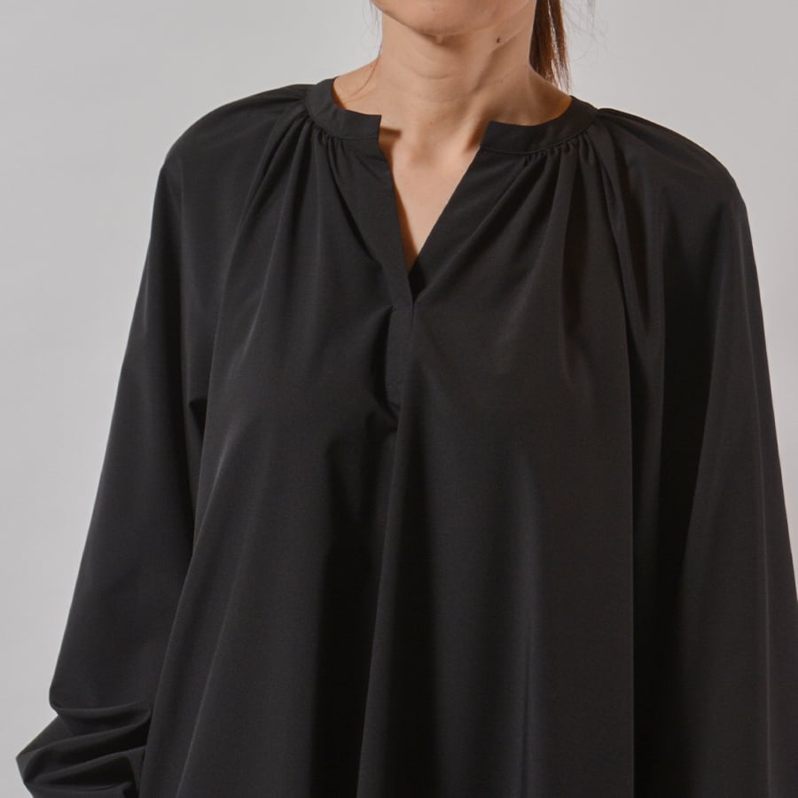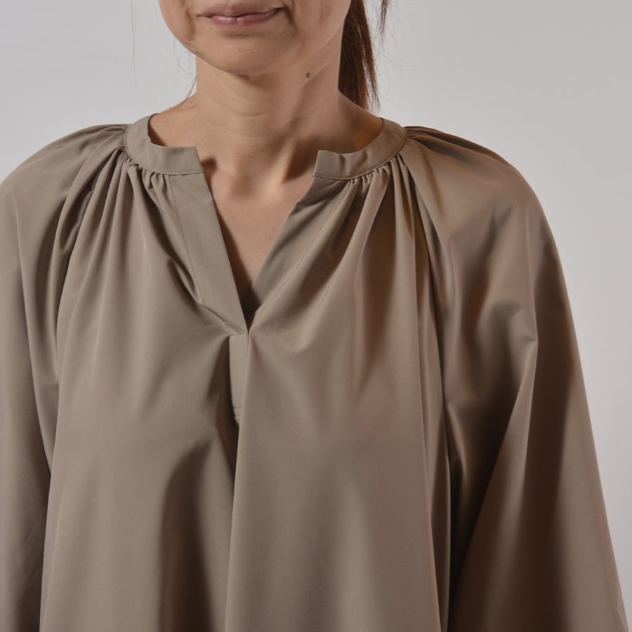 ボリューミーな袖と、ギャザーを入れたネックが特徴のワンピース。