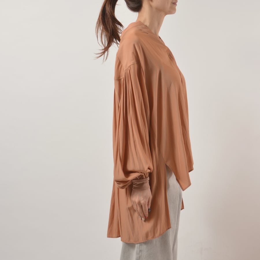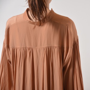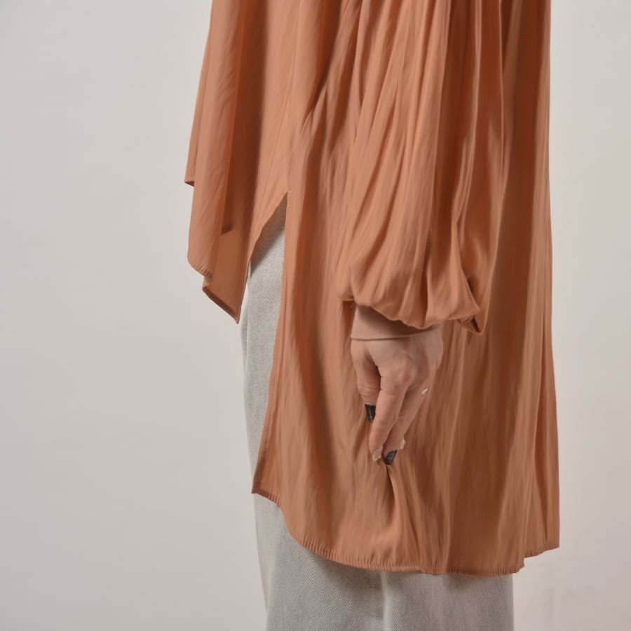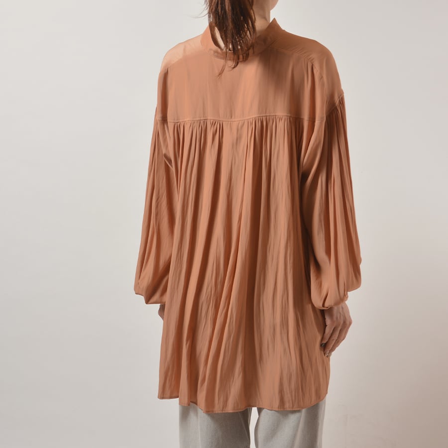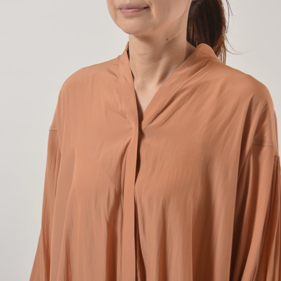 綺麗なドレープと光沢のクレープ素材を使用。しっとりとした肌触りの薄手素材で、袖口のみリブに切り替えています。