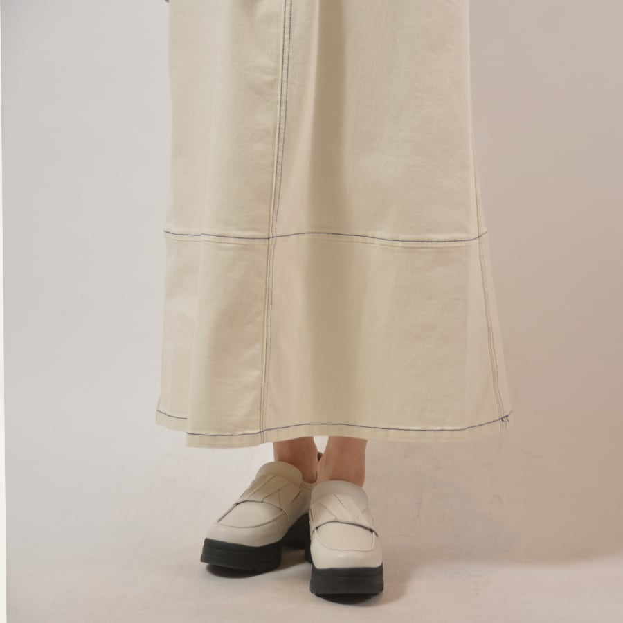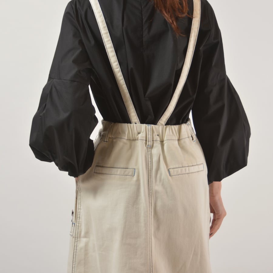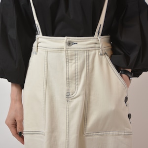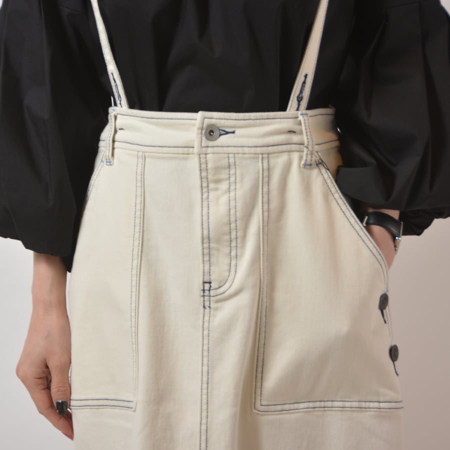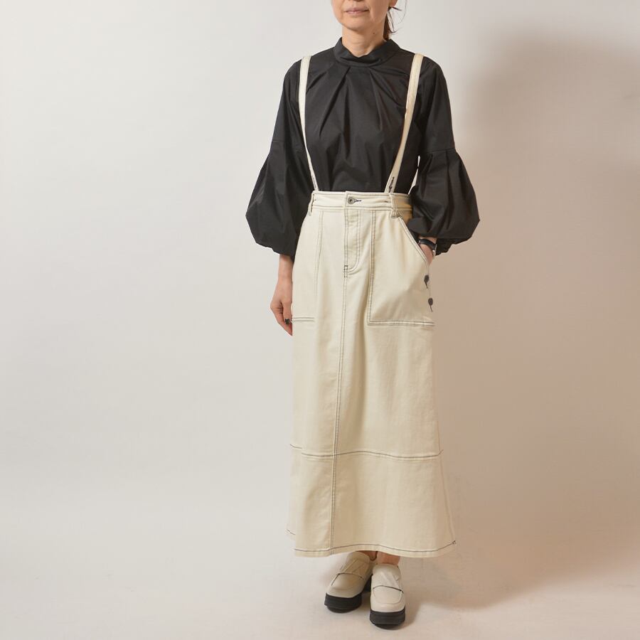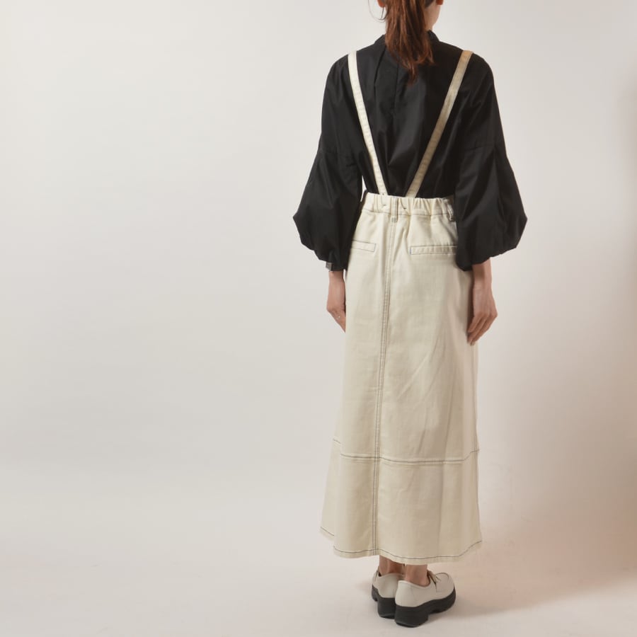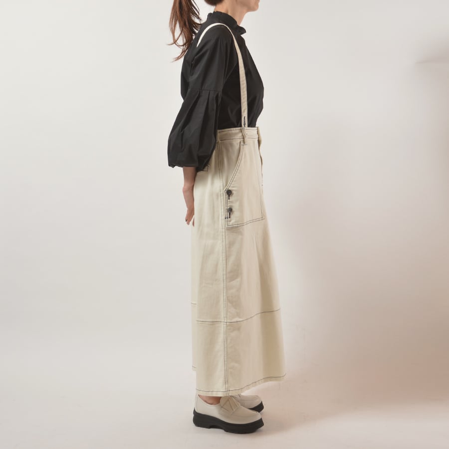 サスペンダー付きのデニムロングスカート。バックウエストにゴム入りで、サスペンダーを外しても着用可能です。