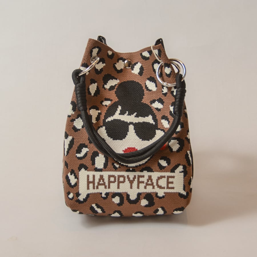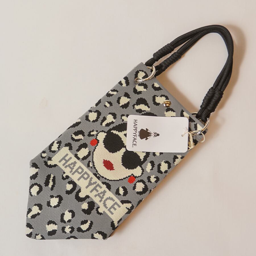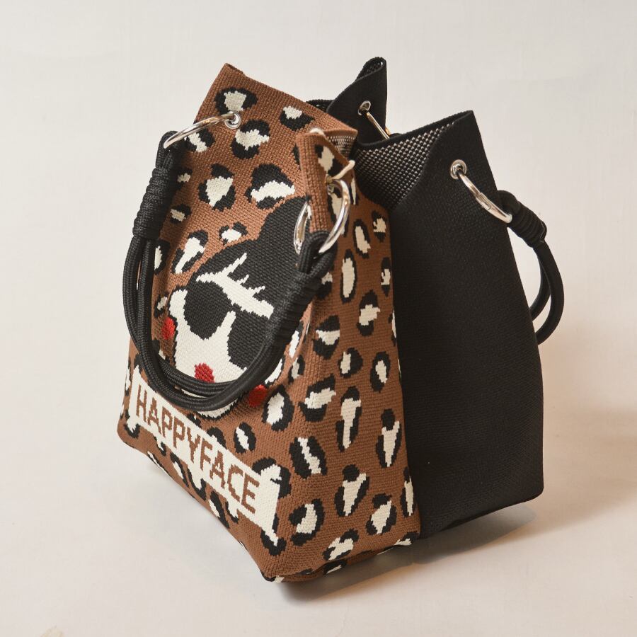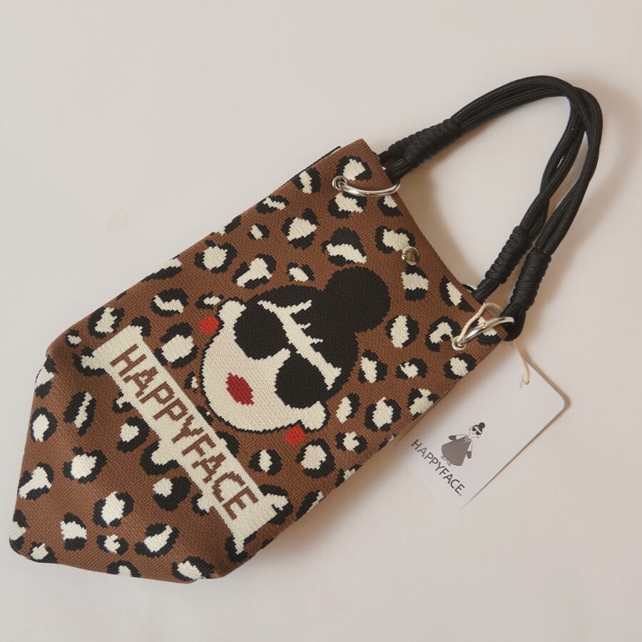 HAPPYFACEの大人気トートバッグ。EMMAの顔+豹柄と、黒無地+ロゴの2面デザイン。その日の気分に合わせて、表側に向ける面を選んでください。