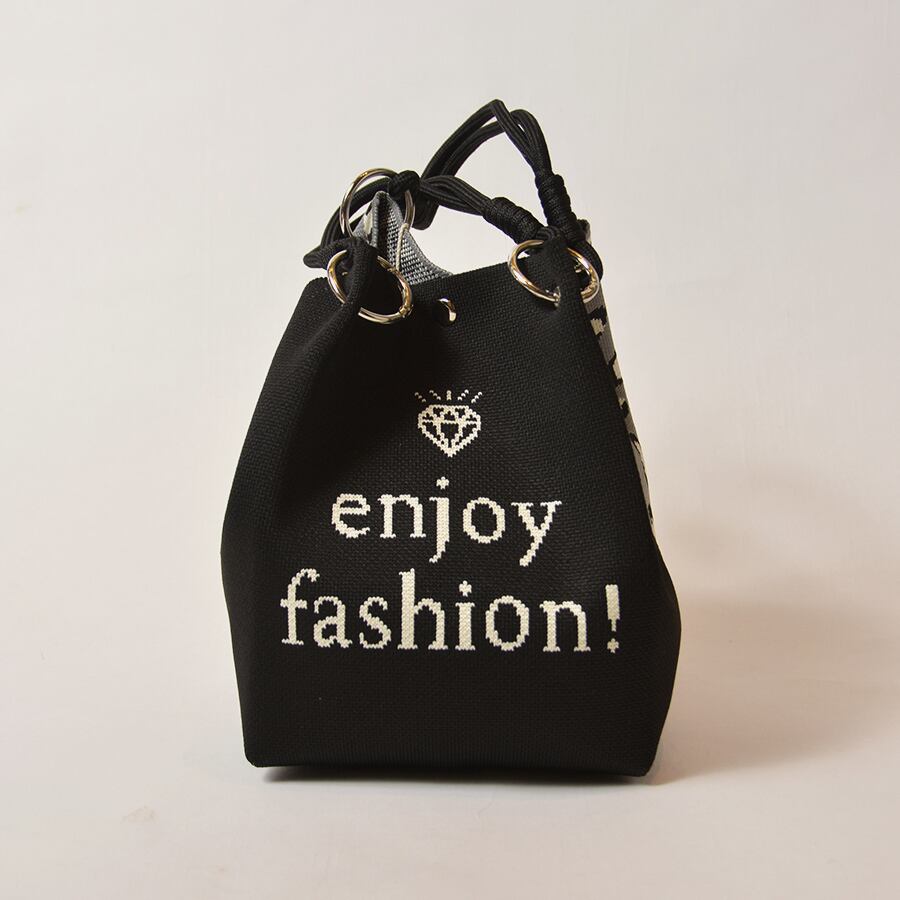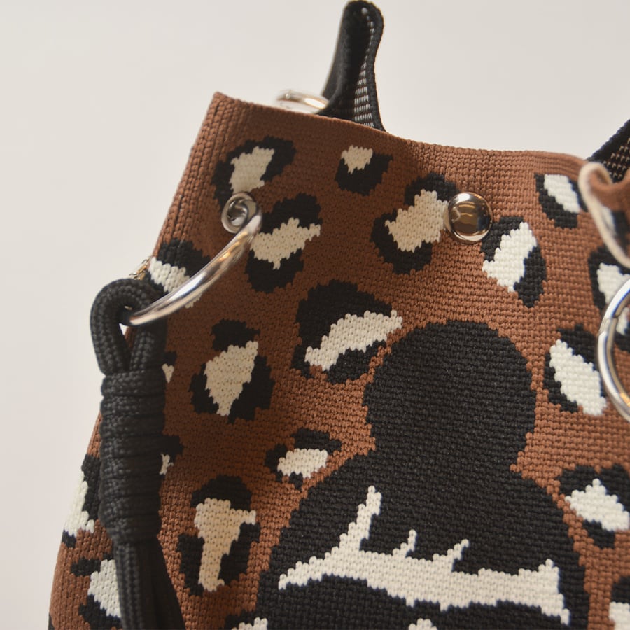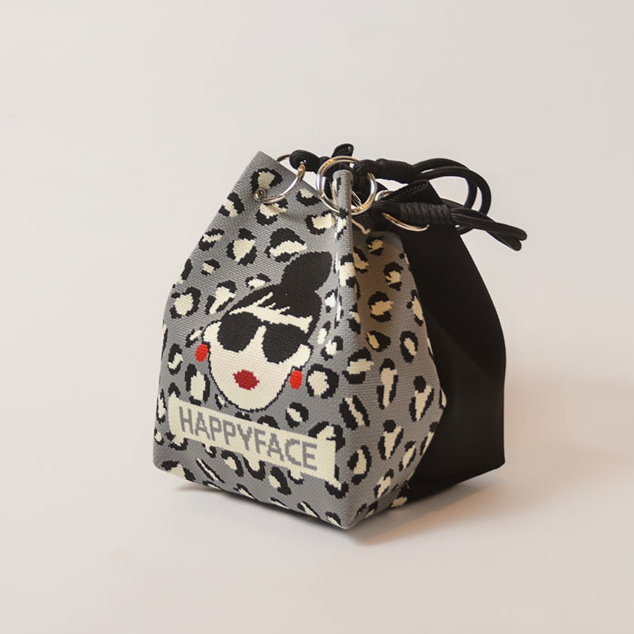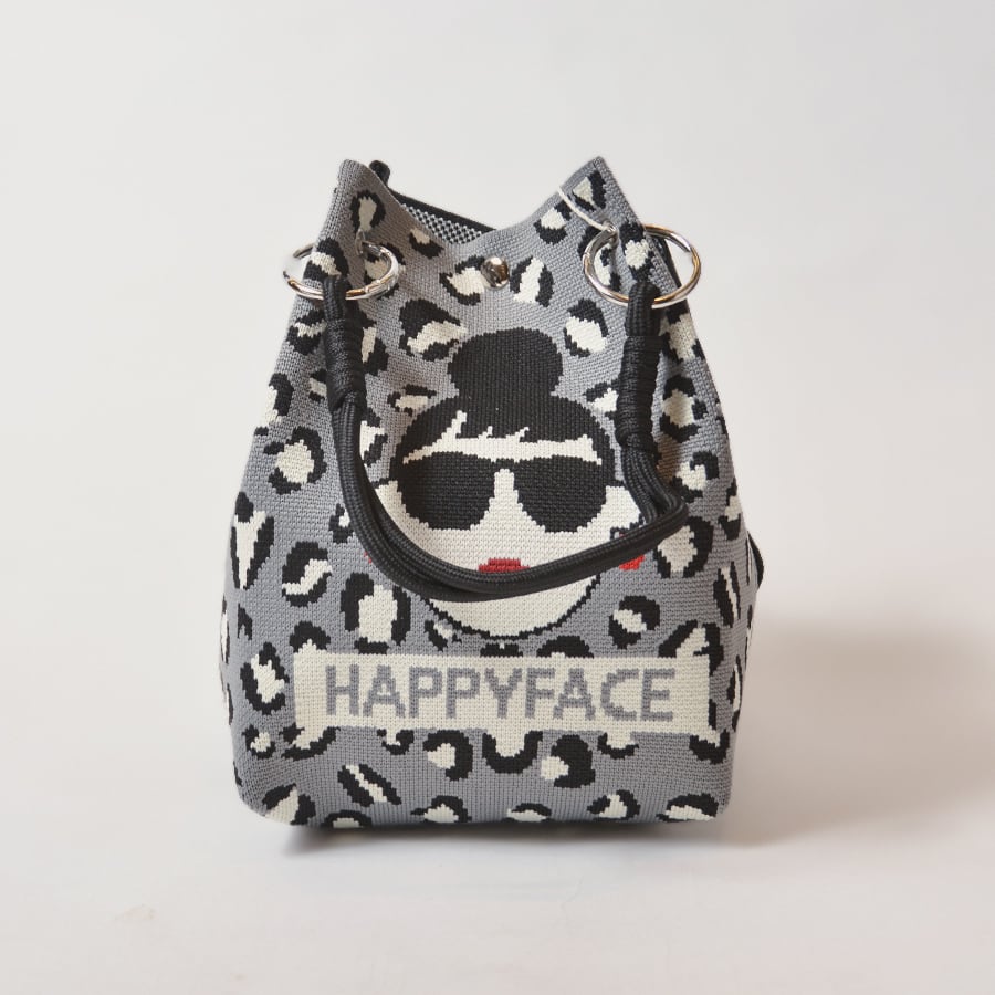 HAPPYFACEの大人気トートバッグ。EMMAの顔+豹柄と、黒無地+ロゴの2面デザイン。その日の気分に合わせて、表側に向ける面を選んでください。