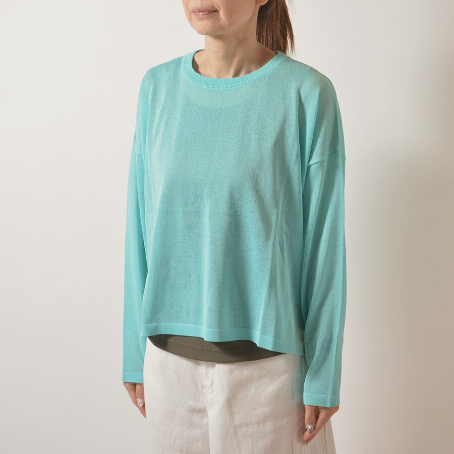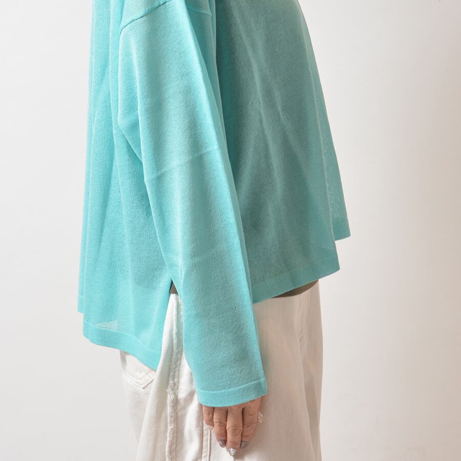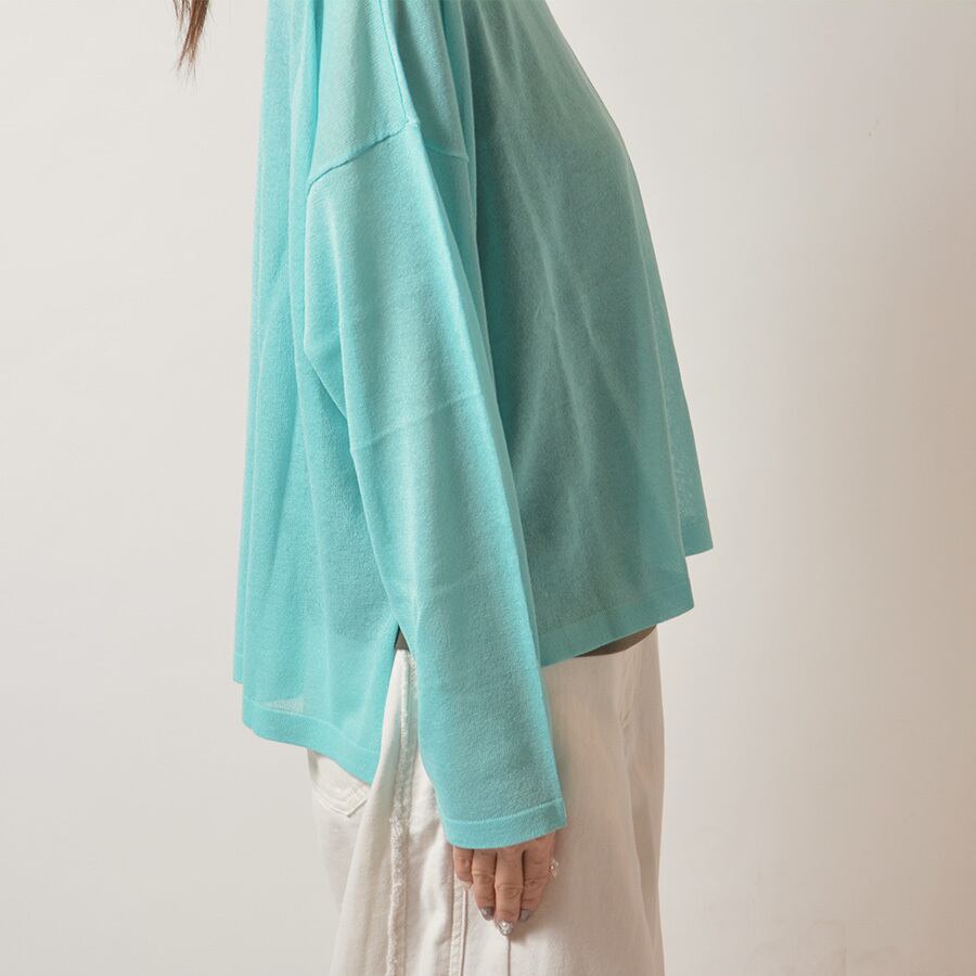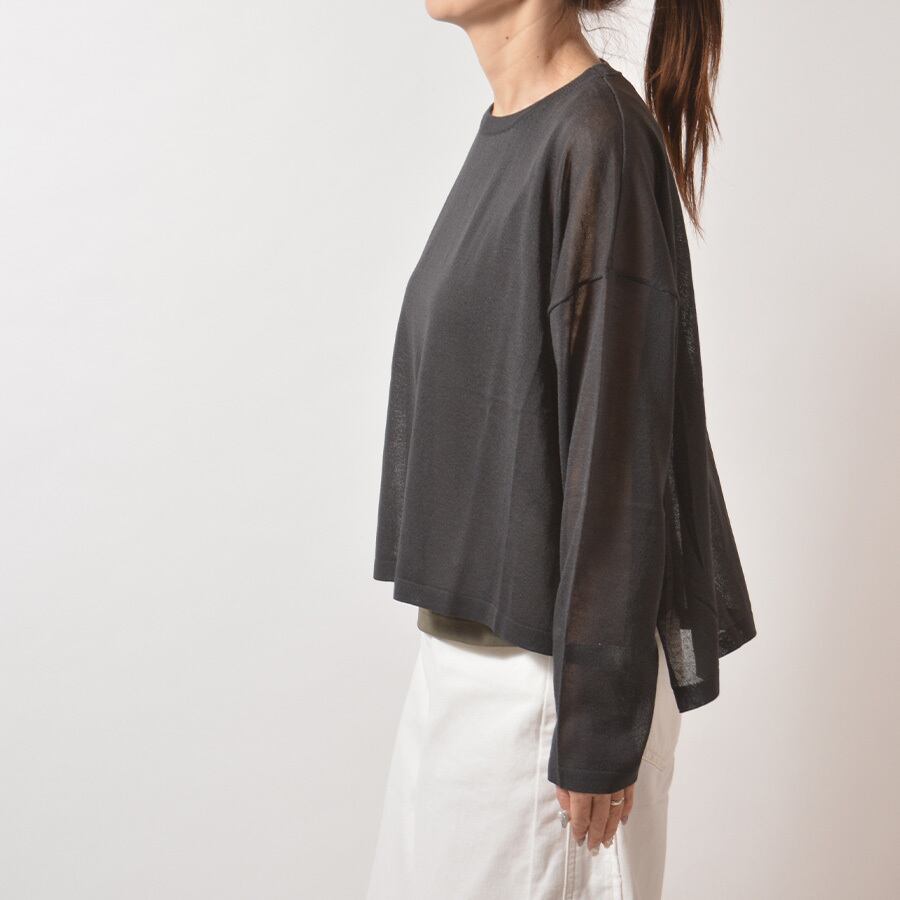 透け感があるレーヨンのサマーニット。サイドスリット入りで、後ろの着丈が長いシルエットです。