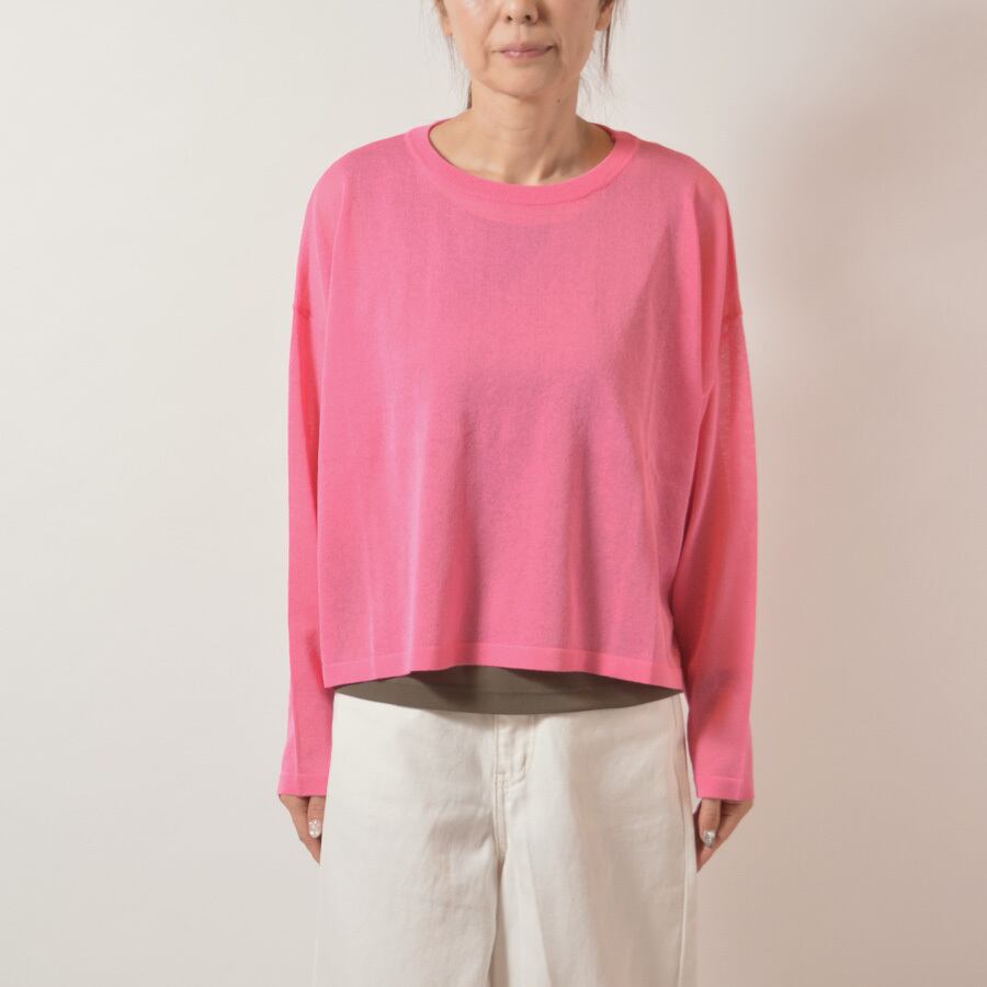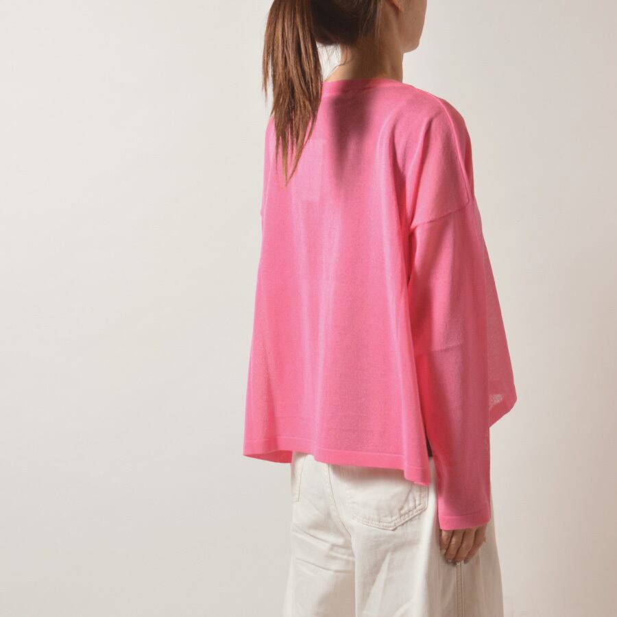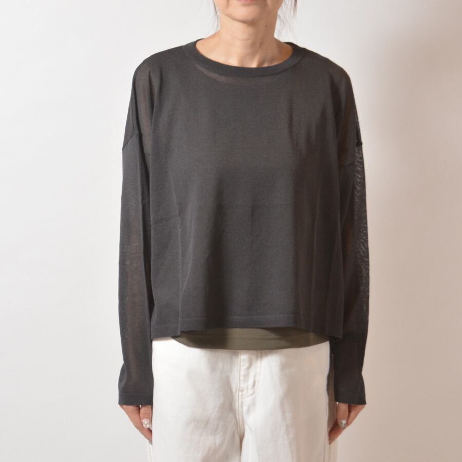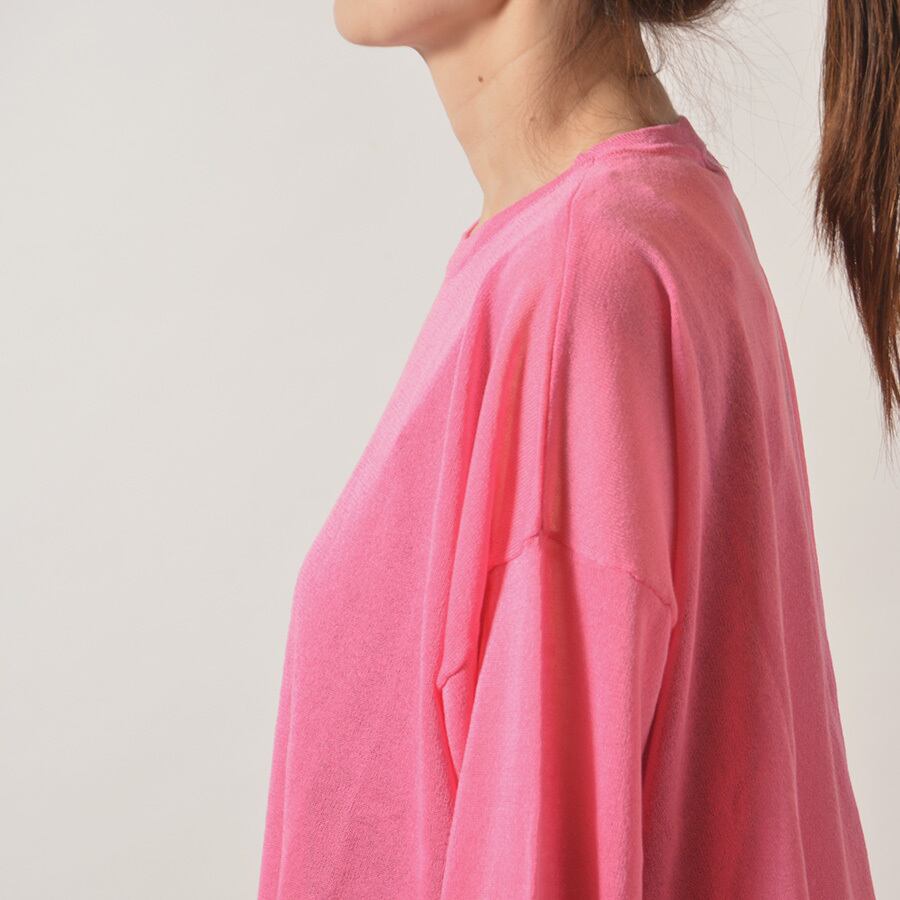 透け感があるレーヨンのサマーニット。サイドスリット入りで、後ろの着丈が長いシルエットです。