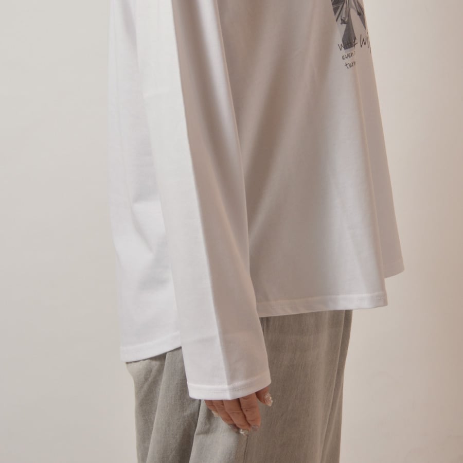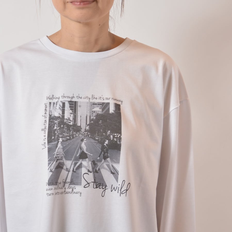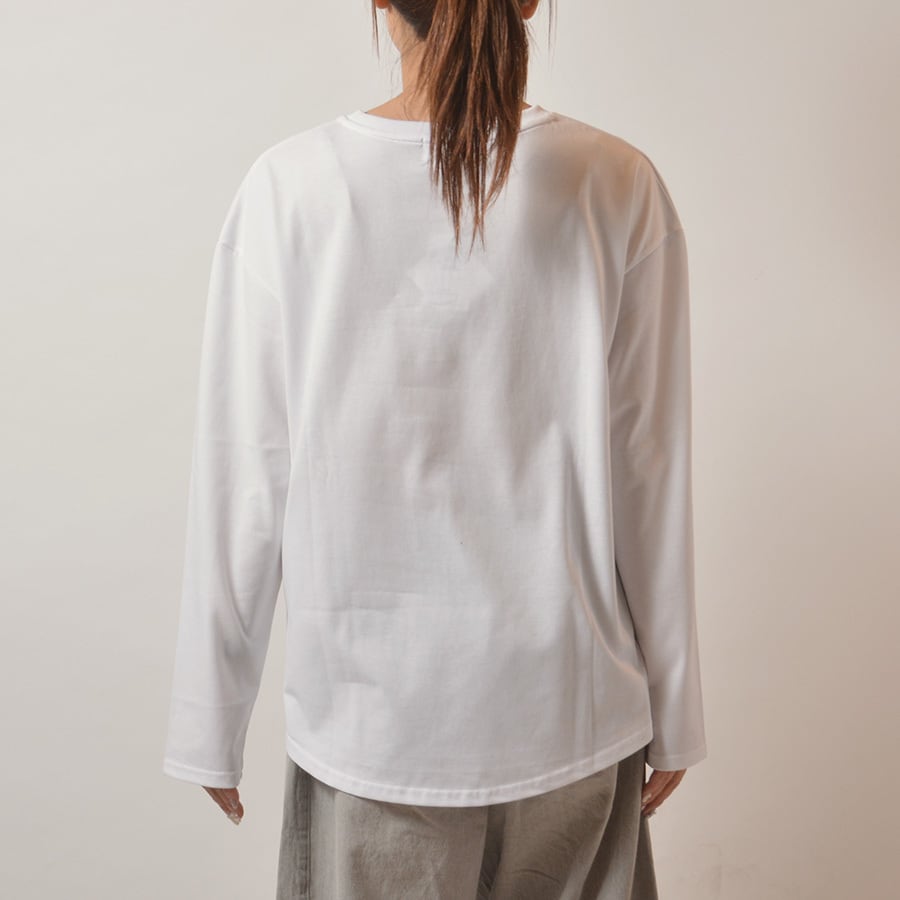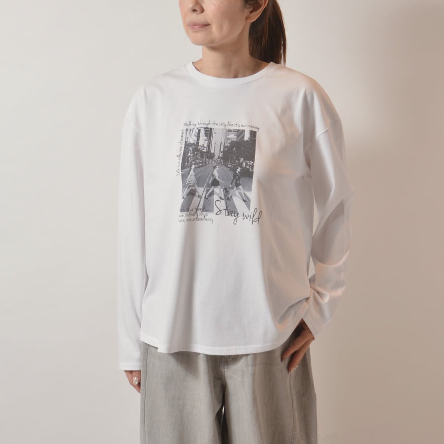 ゆったりしたシルエットのモノトーンプリントカットソー。柔らかくて伸縮性も持たせたコットン&ポリエステルのカットソー生地です。